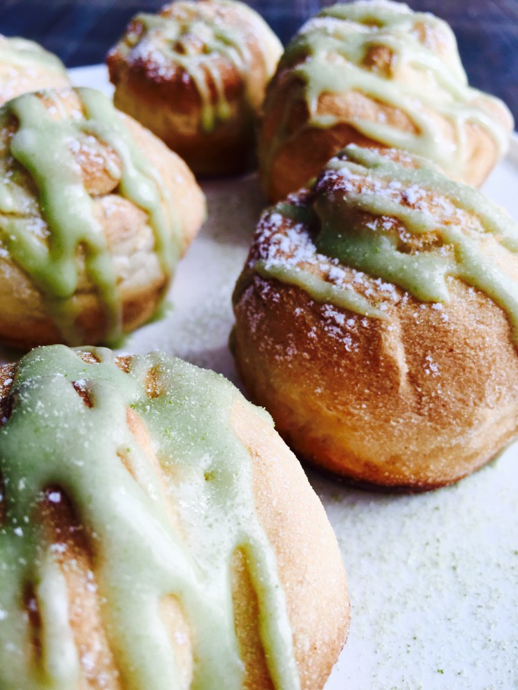 Formate le palline da circa 50 gr ognuna. Poi stendete con le dita l’impasto e formate un rotolino, spolverate un pochino di the Matcha e arrotolatelo su se stesso, io li ho messi nello stampo da muffins. Lasciate lievitare ancora mezz’ora e poi fate cuocere in forno a 200º statico per circa 15/18 minuti.