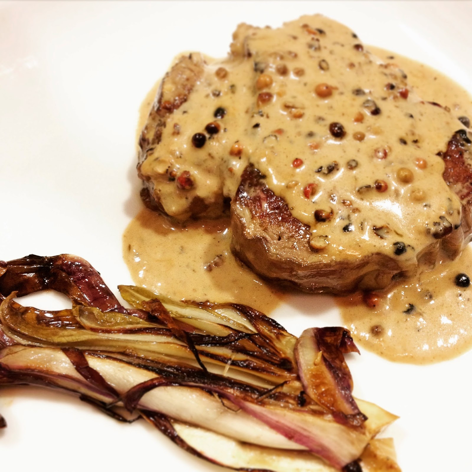 Per la versione rapida,grigliate il filetto e lasciatelo riposare. A parte in una padella rosolate olio, pepe rosa e nero e panna, lasciate rapprendere e unite.