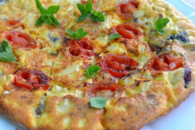 La frittata di oggi, dicevo, incontra sapori classici, patata e pomodoro, ma con un tocco di Mediterraneo, ho messo feta e origano fresco. Che profumo! Da rifare quanto prima.