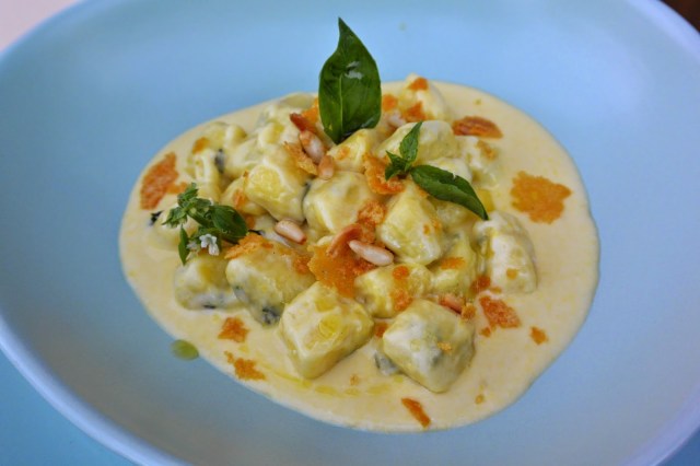 Gnocchi al basilico con fonduta di pecorino e croccante di parmigiano e pinoli