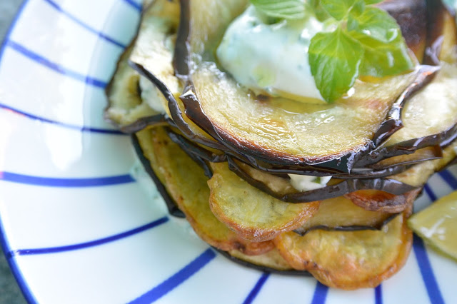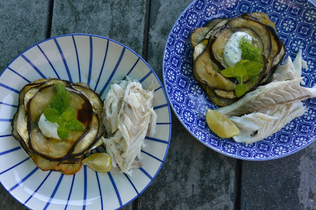 La ricetta di oggi è una croccante millefoglie di patate e melanzane, potete farla anche solo di melanzane, sarà buona comunque. L’ho accompagnata con una salsina di yogurt aromatizzata alle erbe aromatiche. Il pesce, freschissimo, è un branzino pescato. Non ho voluto stravolgere il suo sapore delicato per cui ho fatto una cottura semplice. Il suo sapore era buonissimo.