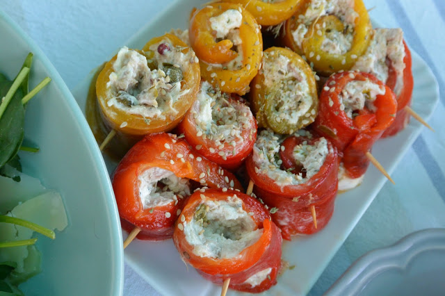 Prendete i filetti di peperone tagliate via le estremità per farlo pari (gli scarti potrete riutilizzarli nella crema per riempire le uova della prossima ricetta), spalmate uno strato di farcitura e arrotolatelo, poi fermatelo con uno stuzzicadenti.