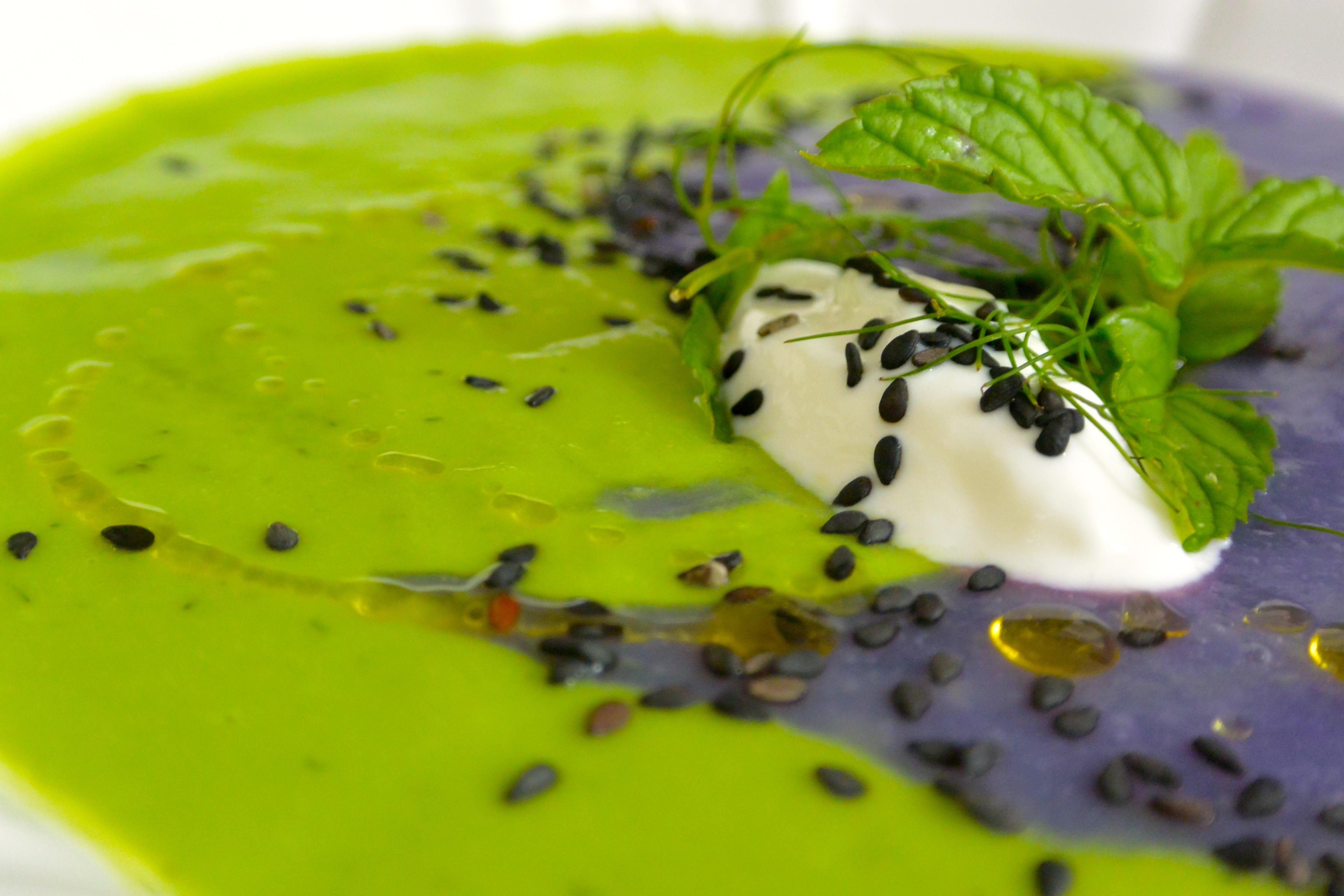 Per servirle, mettete nel piatto qualche cucchiaio della vellutata green, da una parte, poi aggiungete nell’altra parte altri cucchiai di vellutata violet, poi con il palmo della mano date qualche colpetto sotto al piatto, giratelo (come se doveste fare una curva con il volante della macchina per intenderci 🙂 ahaha) poi servite con un pochino di olio Extra Vergine di Oliva a crudo, un po’ di sesamo nero e se volete una cucchiaiata di yogurt greco.