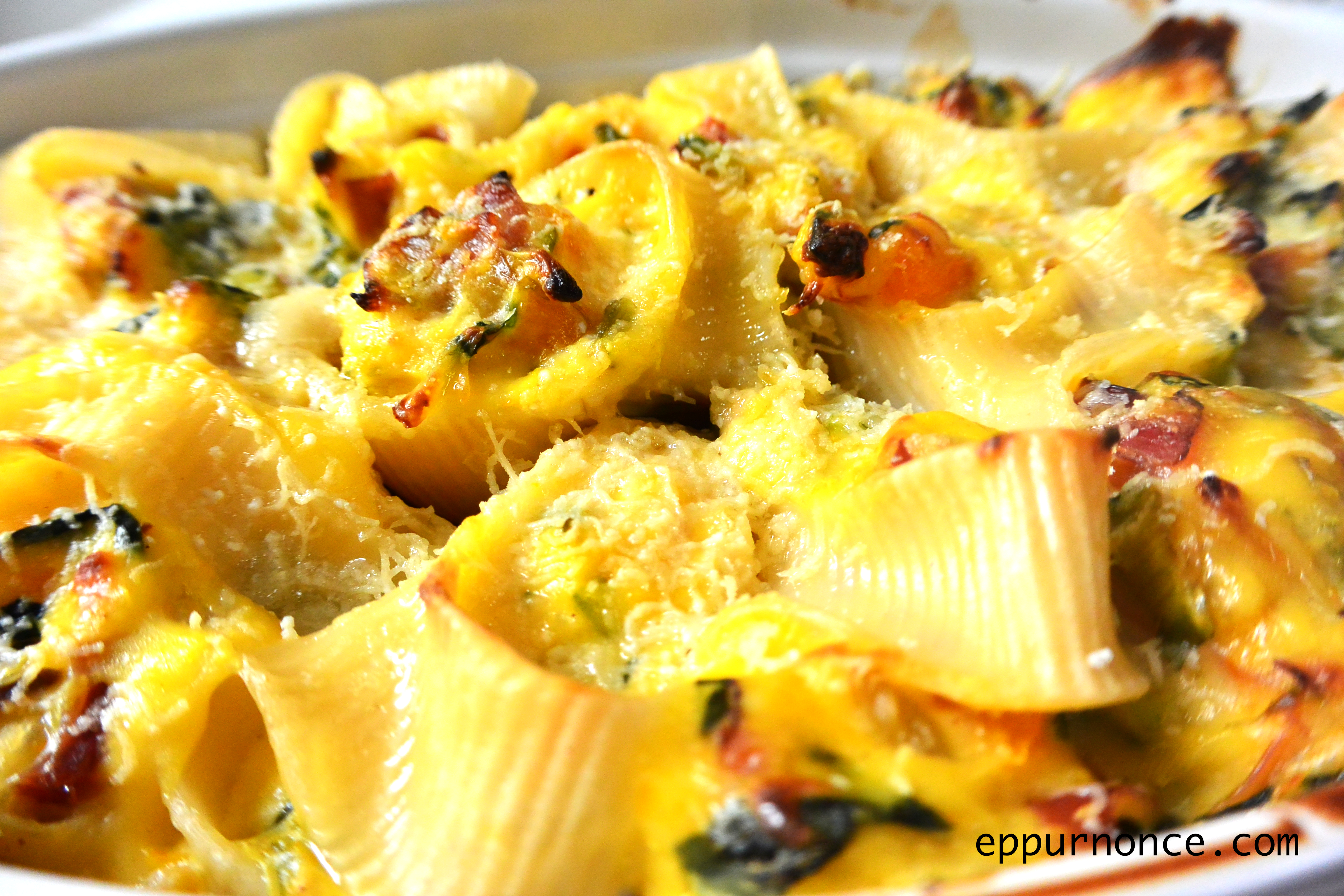 Prendete una pirofila di ceramica (da mettere in tavola) fate un leggero strato di besciamella sul fondo e adagiate i lumaconi, poi riempitene uno alla volta, facendo attenzione che si riempiano bene, negli spazi tra un lumacone e l’altro mettete altra besciamella, poi è necessario mettere qualche fiocchetto di burro qua e là per non fare bruciare la pasta e parmigiano se volete! (a me un pochino si sono bruciati, vi dico la verità, se li rifaccio farò più besciamella e poi li coprirò abbondantemente, ma come vi ho scritto sopra, io aaaamo la besciamella… Lascio a voi la scelta!)