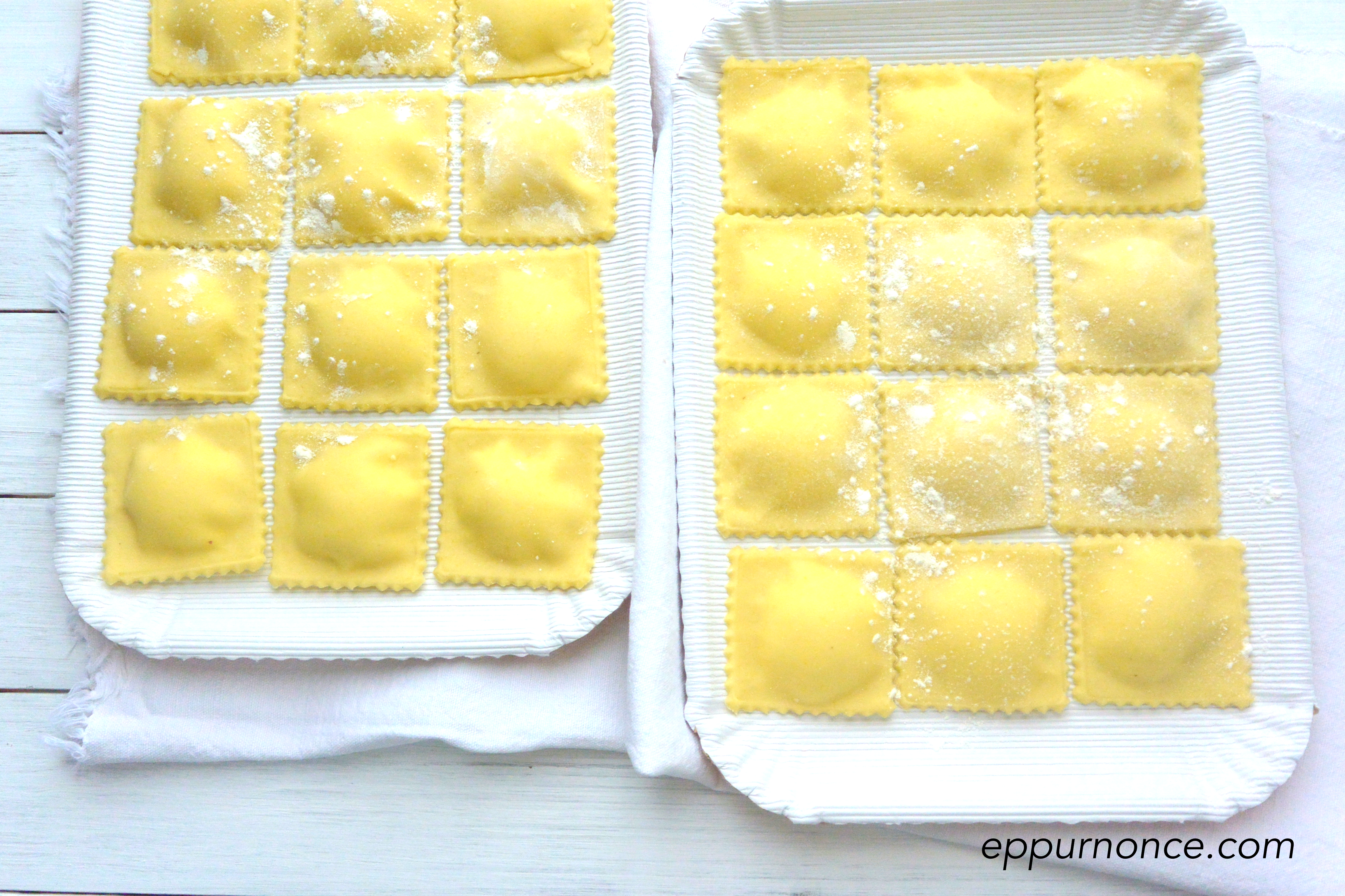 Appoggiate la pasta tirata sul tagliere e mettete un cucchiaino di ripieno distante dall’altro circa 3 cm. Coprite con un altro pezzo di sfoglia tirato e con le dita iniziate a far aderire le sfoglie, eliminando l’aria che rimane attorno al ripieno. Sigillate bene i ravioli e tagliateli con la rotella. Sistemateli su di un vassoio leggermente infarinato.