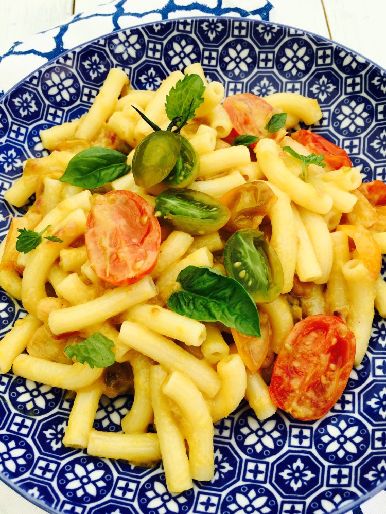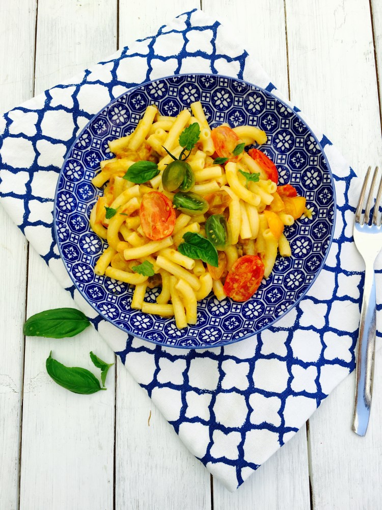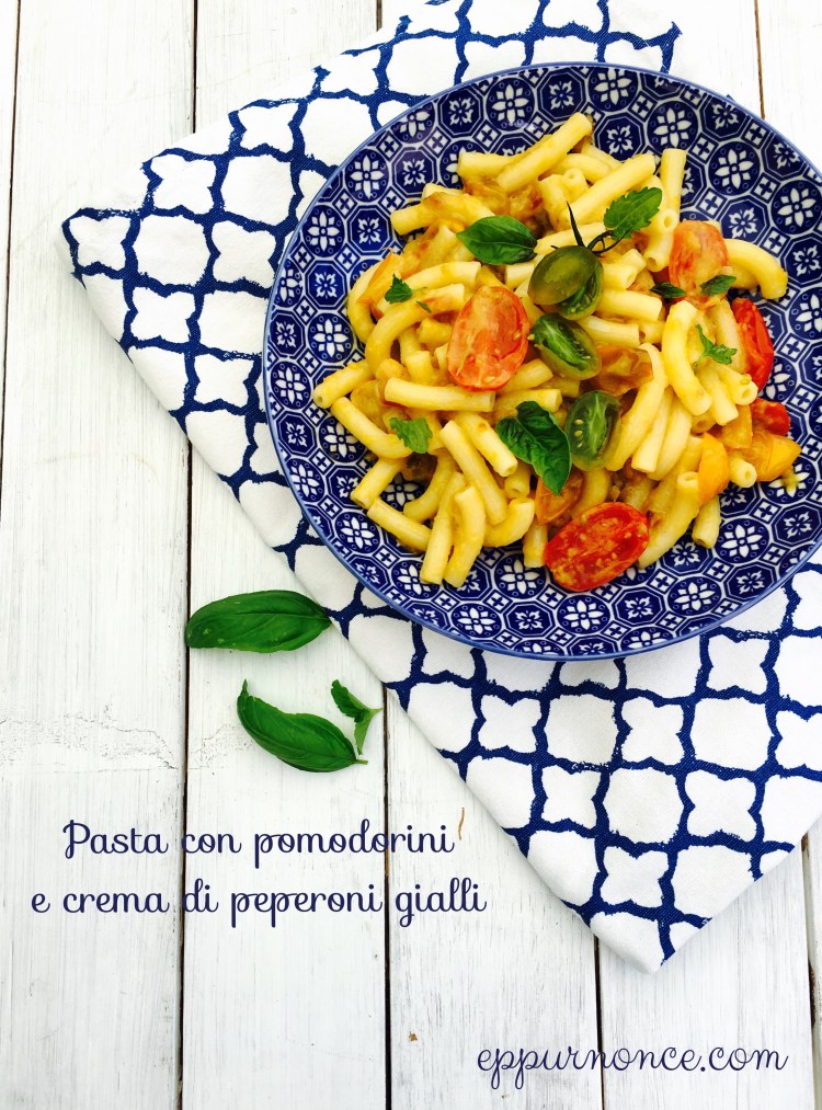 Fate cuocere la pasta in acqua salata bollente e dopo averla scolata saltatela in padella coi pomodorini, aggiungete la crema di peperoni a fiamma spenta ed amalgamate.