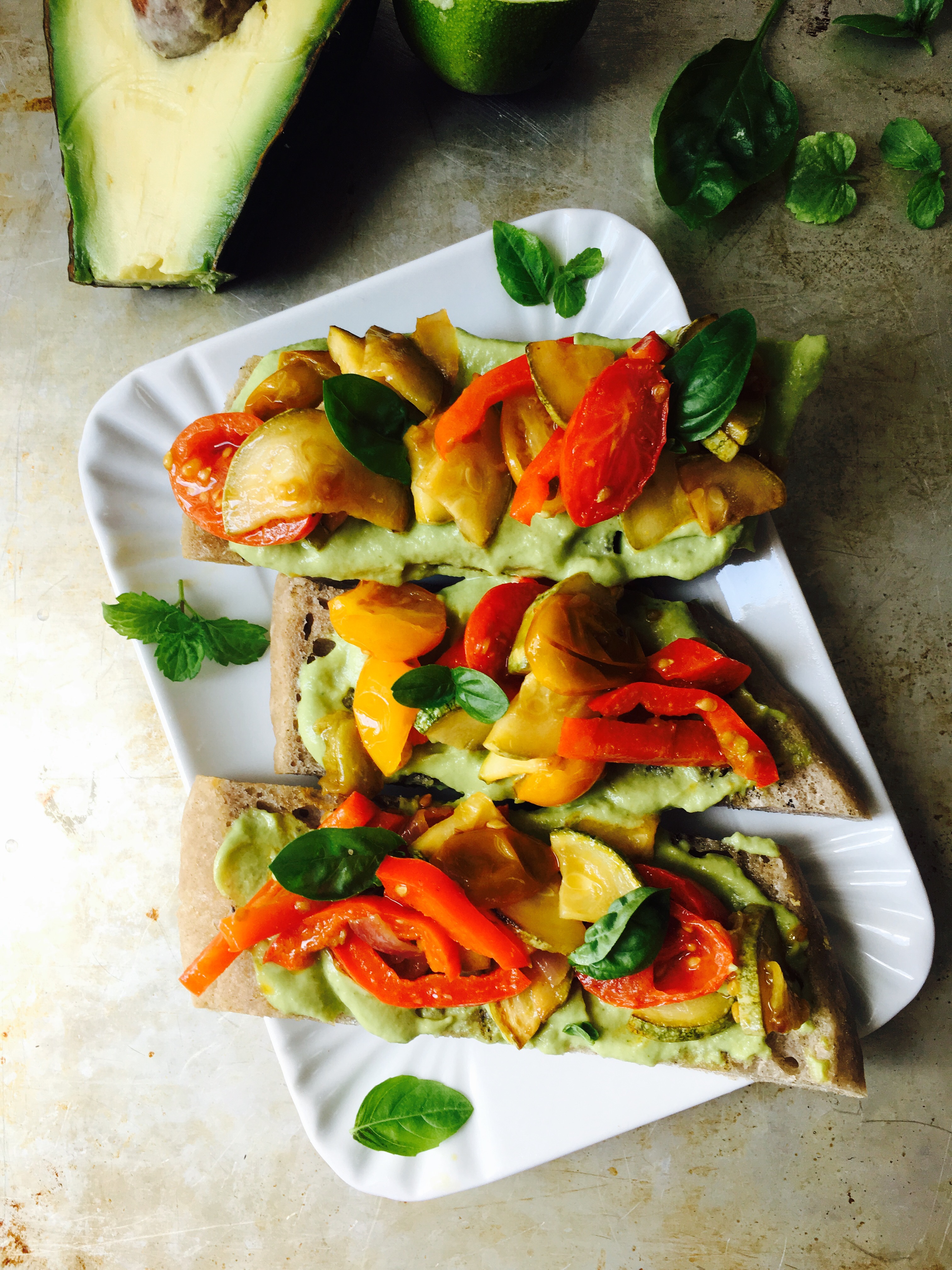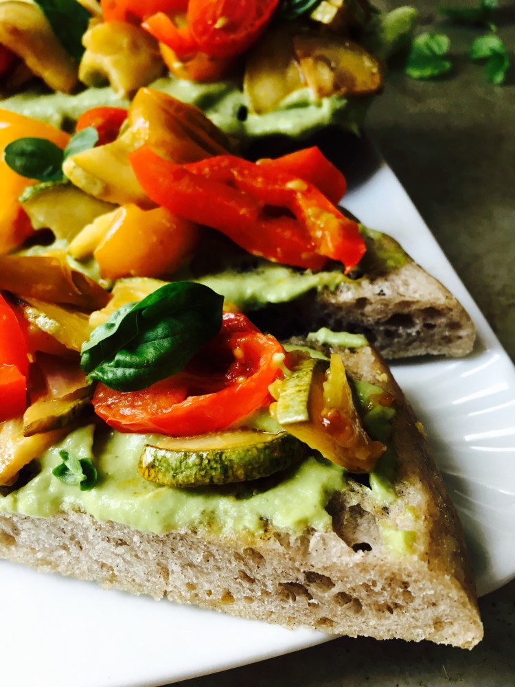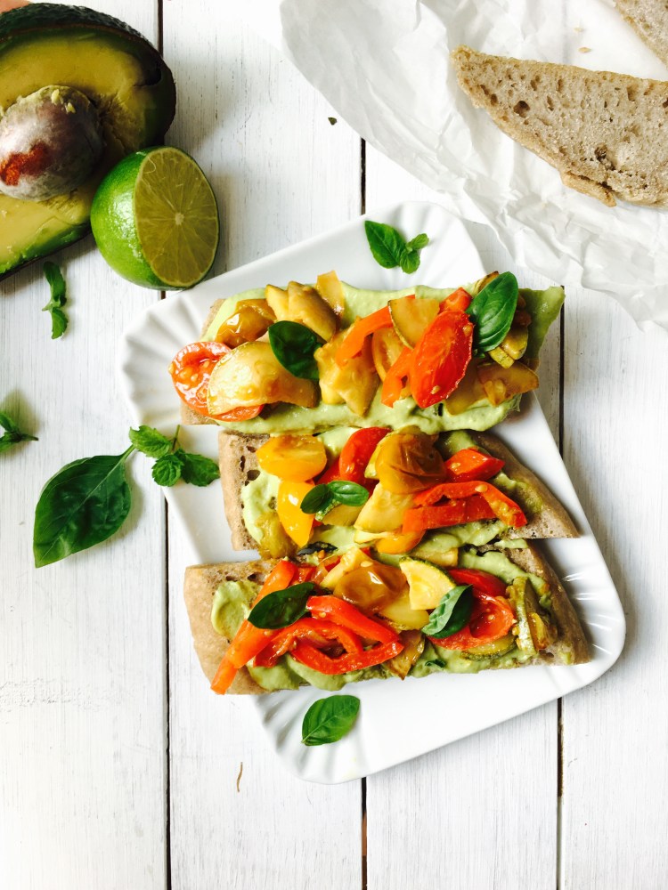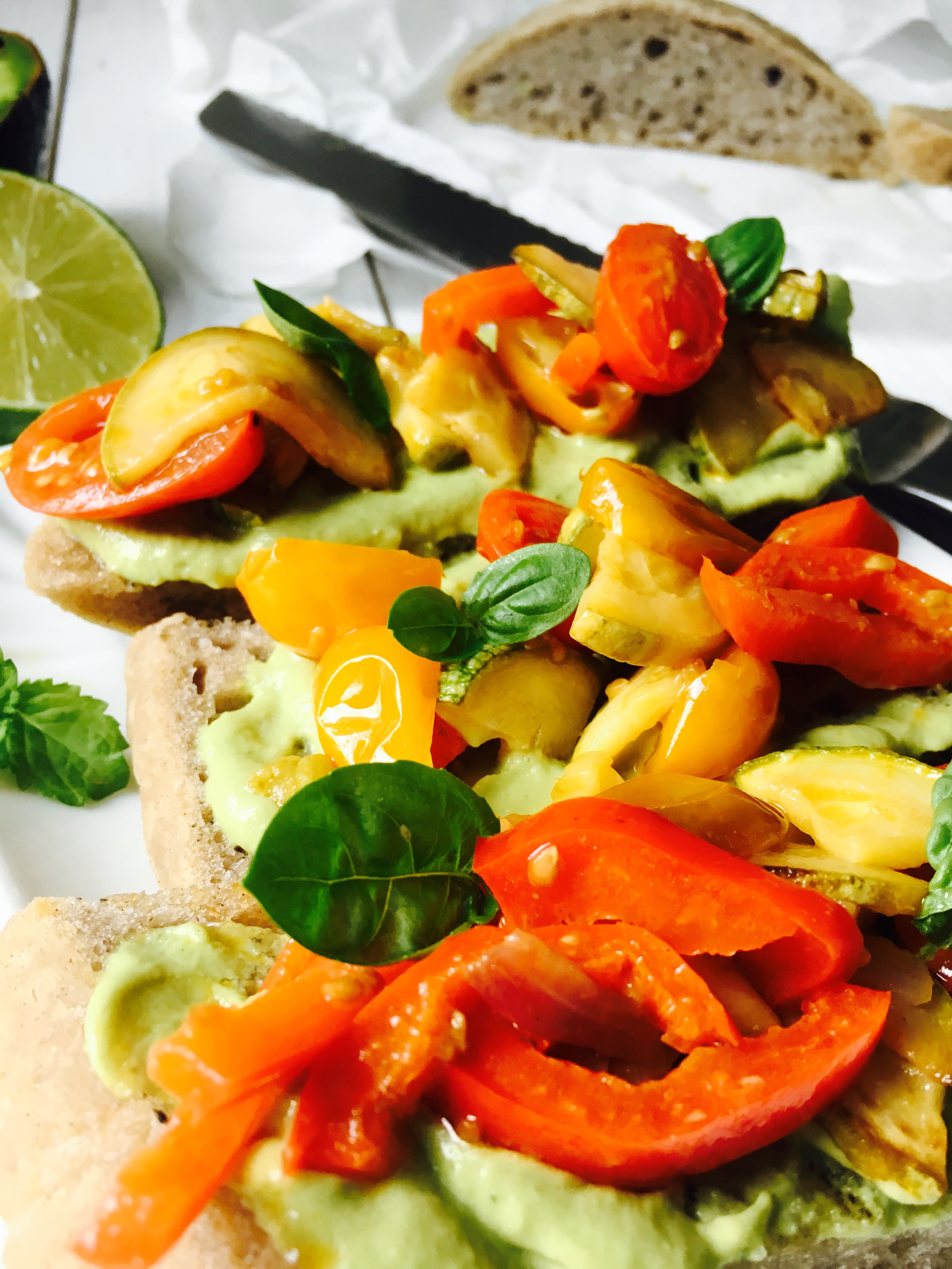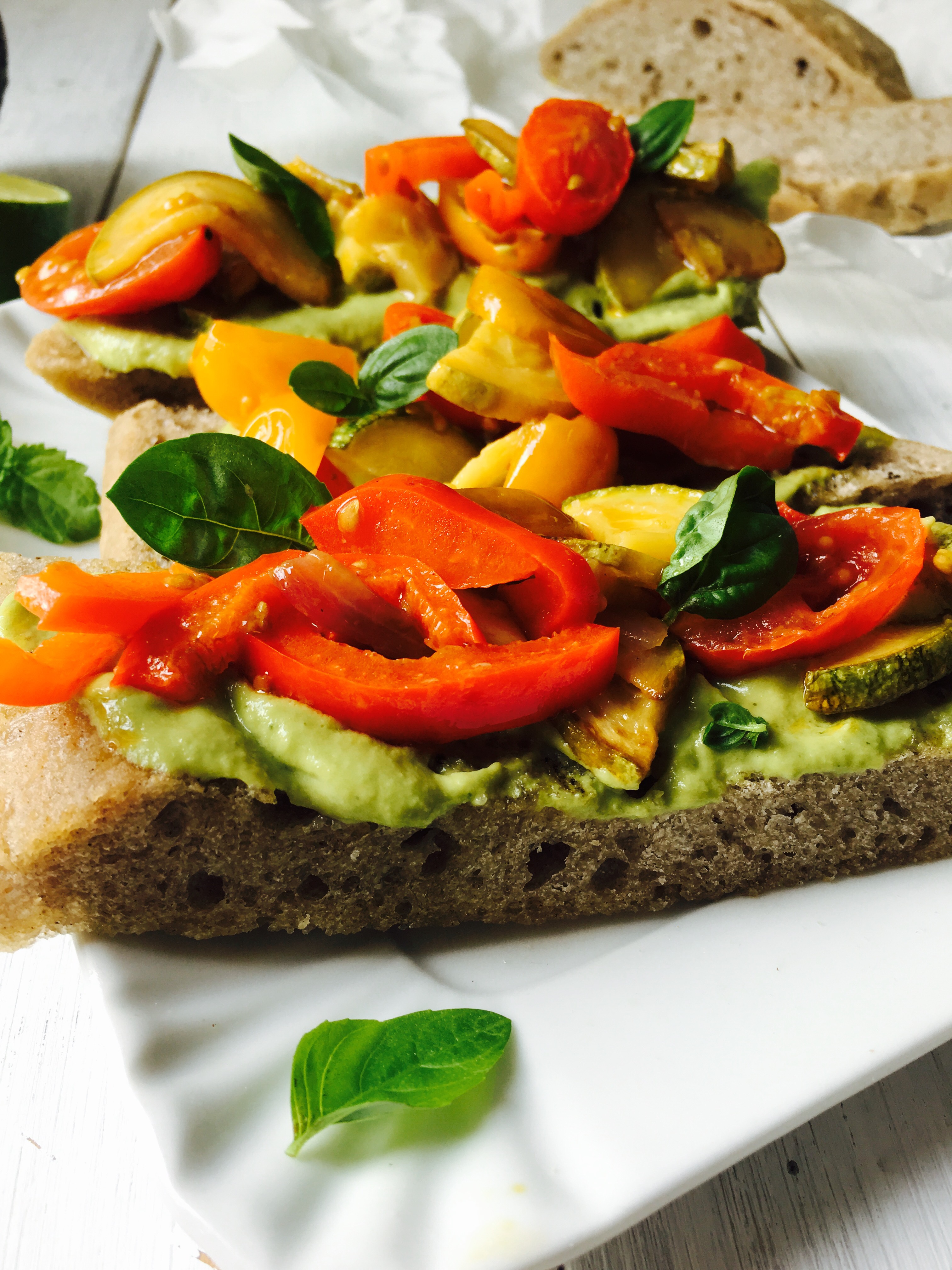 Tagliate il pane a fette e tostatelo in una bistecchiera leggermente oleata (io verso un goccio di olio in uno scottex poi lo passo sulla bistecchiera, così non farà fumo), poi mettete una cucchiaiata generosa di crema e sopra le verdure!