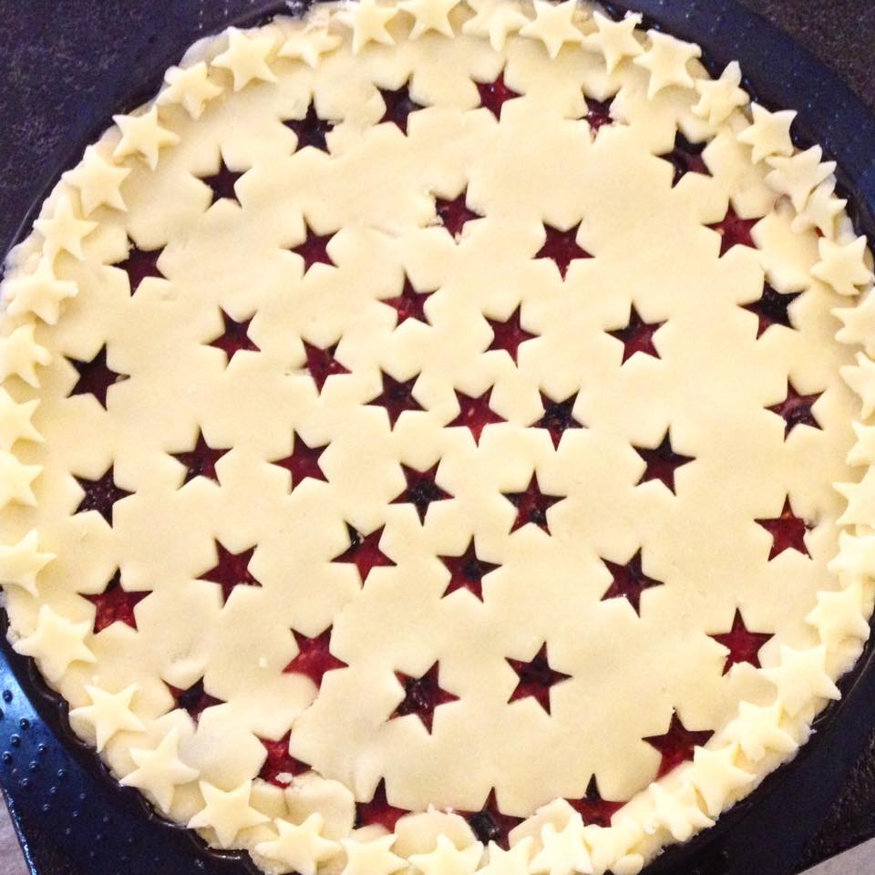 Crostata con crema frangipane di mandorle, cocco e pistacchi con ciliegie al chiaro di luna
