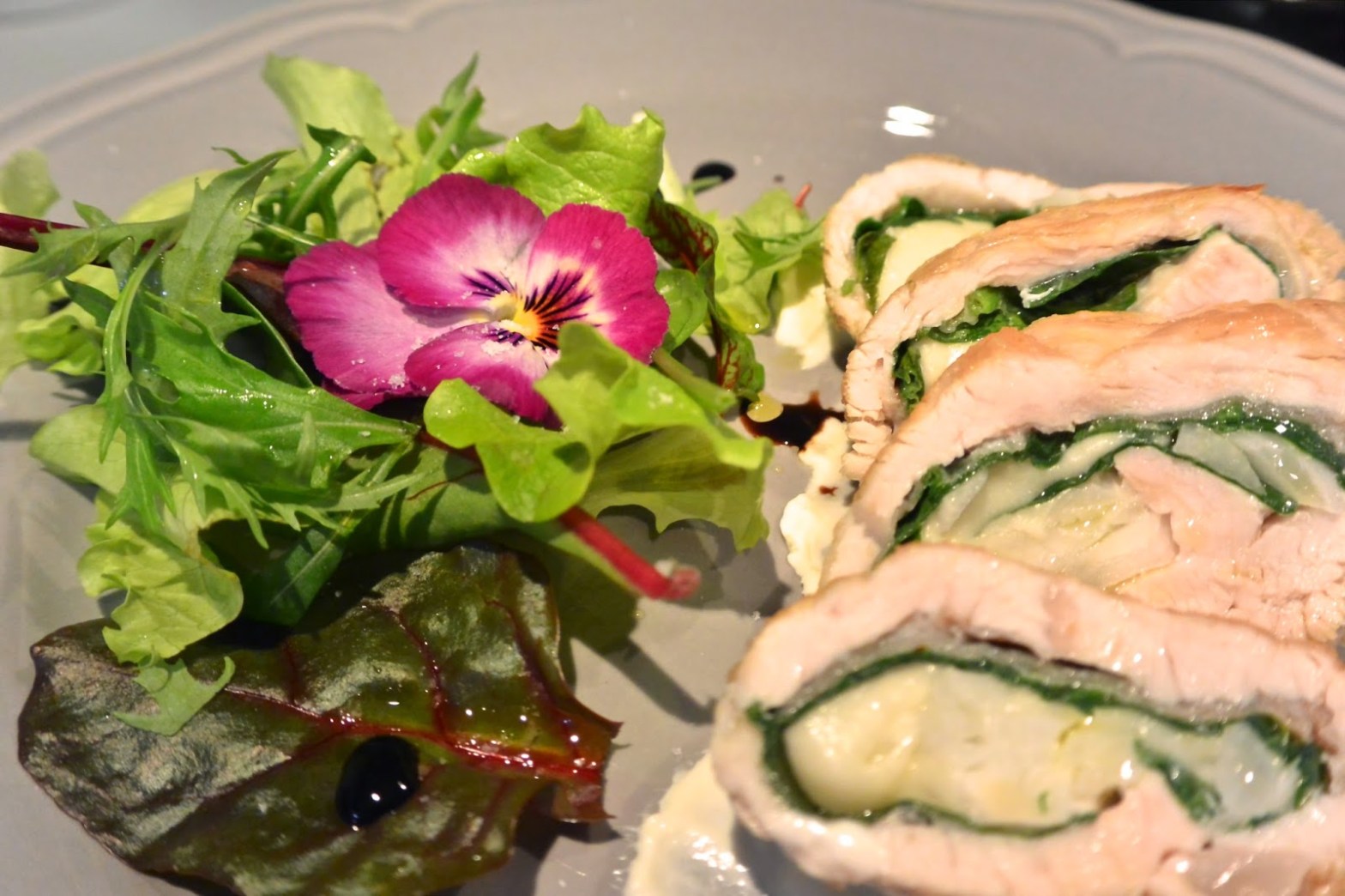 Rotolino di tacchino agli spinaci e pecorino con misticanza fiorita